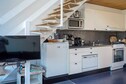 Cucina/soggiorno open space con zona pranzo e zona salotto per la vita in famiglia. La cucina è dotata, tra le altre cose, di piano cottura in vetroceramica e forno. Il soggiorno ha un soffitto aperto fino al colmo per una sensazione di ariosità. Una pompa di calore a basso impatto ambientale è disponibile per le giornate più fresche. Molta luce naturale entra dalle ampie porte-finestre. L'arredamento è confortevole e in stile scandinavo. Accesso diretto dal soggiorno alla terrazza con zona pranzo e barbecue a carbone. Parcheggio direttamente di fronte all'appartamento.