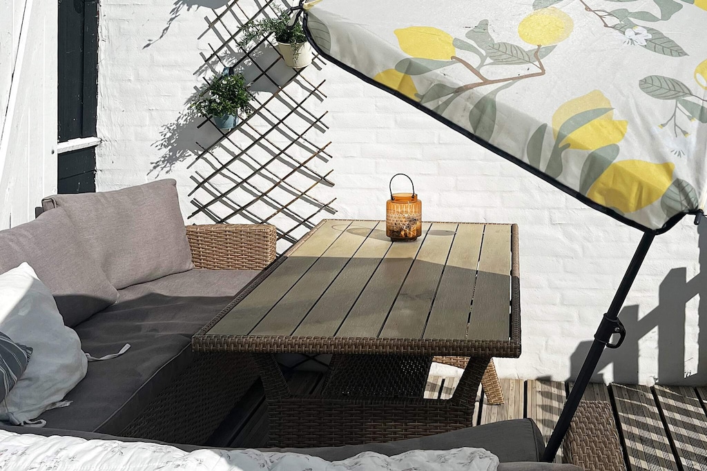 L'appartamento si sviluppa su due livelli e comprende tre camere da letto separate: una al piano terra con letto matrimoniale e due al piano superiore, ciascuna con due letti singoli, rendendolo ideale per famiglie o gruppi. La cucina e la zona giorno a pianta aperta dispongono di un tavolo da pranzo, una comoda area salotto e un moderno forno combinato. Le ampie porte-finestre e l'alto soffitto della zona giorno creano un'atmosfera spaziosa e ariosa. L'accesso diretto dalla zona giorno conduce a una terrazza con tavolo da giardino e barbecue a carbone per pranzi e cene all'aperto.