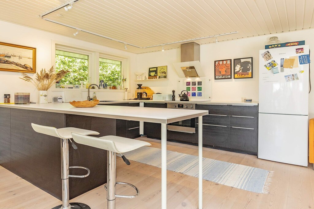 L'atmosfera è luminosa e accogliente all'interno di questa casa estiva di 90 m², costruita nel 1972 e ristrutturata più volte. La planimetria è adatta per sei persone, con tre camere da letto e un'ampia zona giorno con soggiorno e cucina a pianta aperta. Se desiderate riunirvi per una deliziosa cena, questo è il luogo perfetto per farlo, e in seguito potrete spostarvi nella zona divani per una piacevole chiacchierata o per guardare un film. Infine, la planimetria è completata da un bagno con lavatrice e doccia.