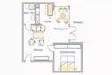 L'appartamento ha anche un bagno con doccia e WC. Una cucina completa all'americana (aperta sulla zona giorno) fa sembrare questo appartamento particolarmente spazioso. Nella camera da letto separata troverete un letto matrimoniale e un ampio armadio. Tutta la zona giorno (eccetto il bagno e il giardino d'inverno) è dotata di pavimentazione tessile.