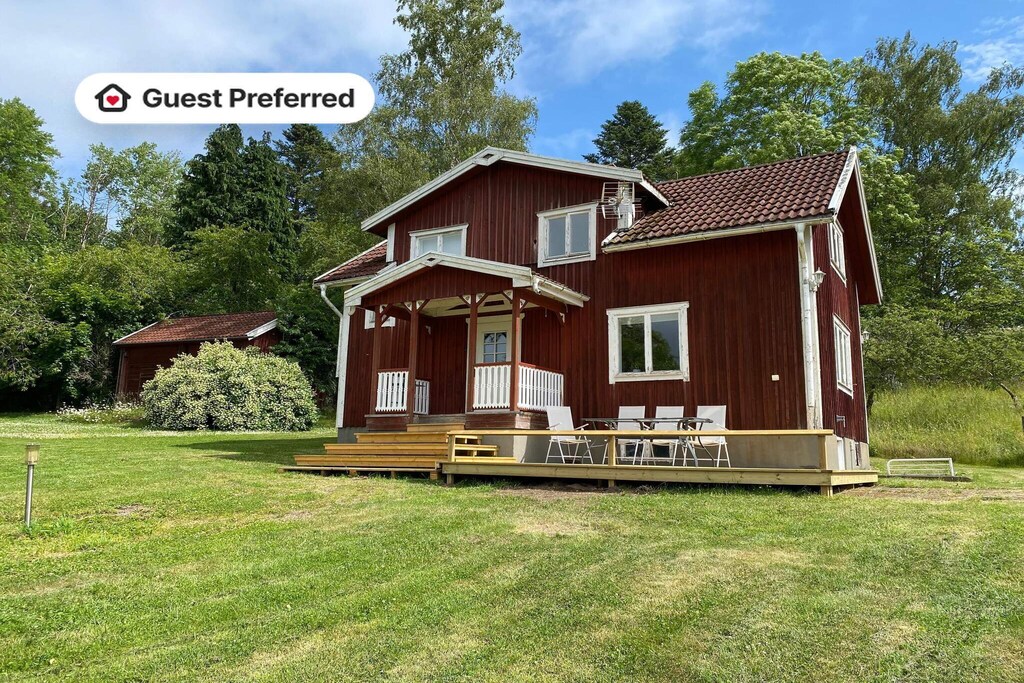 Slow down and enjoy the peace. An idyllic and charming red cottage with that little extra that gives a feeling of calm and harmony. An accommodation for the large family or the larger group. The house is spacious and suitable for the group that wants to experience peace but be close to beautiful swimming excursions and beautiful surroundings. You are welcomed into a bright hall. To the right is a large living room with plenty of social areas. Adjacent is the house's one bedroom with a convertible bed. The kitchen is modern, white and country style. The charm of the old remains, combined with a new kitchen. Straight ahead is a large bathroom with toilet and shower. The stairs up take you to a large family room with wooden beams and a fireplace. Up here is a large bedroom with a double bed. There is also another bathroom with shower and toilet. Next to the family room is the house's third bedroom with a bunk bed and two single beds. This is how you can live with the whole family and relatives. The house shares land with another house, which can be booked with advantage if you are a large group. House 56391. A warm welcome to beautiful accommodation in a perfect location with pleasant excursions with swimming and nature.