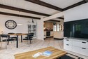 L'appartamento dispone anche di un soggiorno con un ampio tavolo da pranzo, divani e una smart TV con Chromecast integrato.