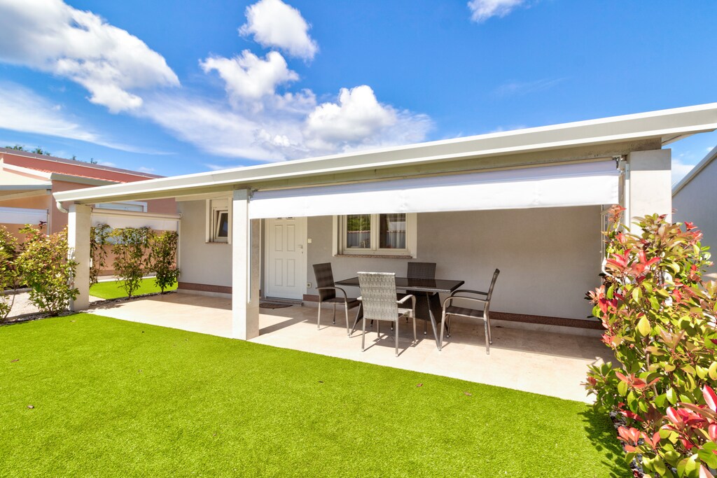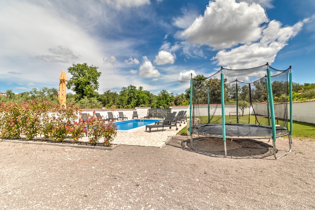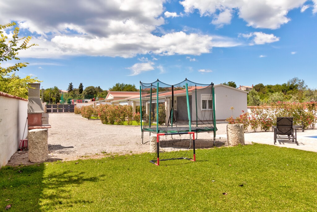 Internamente, la casa dispone di un ampio soggiorno e di una camera da letto con letto matrimoniale pieghevole, TV e aria condizionata, una cucina ben attrezzata con bollitore elettrico, rubinetto per l'acqua bollente, macchina da caffè, forno, microonde, lavastoviglie e frigorifero, e una camera con letti a castello o due letti singoli. La camera da letto principale vanta un letto king-size e un bagno privato con vasca o doccia e WC, completato da un bagno aggiuntivo per la massima comodità. All'esterno, gli ospiti possono rilassarsi sulla terrazza con mobili da giardino, lettini prendisole e barbecue, oppure divertirsi con il trampolino, il campo da tennis, la porta da calcio e i giochi.