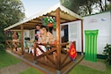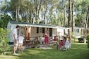 Immerso nell'ombra di imponenti pini, questo grazioso chalet del Baia Domizia Camping Village offre un rifugio tranquillo per un massimo di sei persone. Dotato di due accoglienti camere da letto, due bagni, una zona giorno con TV satellitare e divano letto matrimoniale e un angolo cottura funzionale, è perfetto per coppie, famiglie o piccoli gruppi. Uscite sulla vostra veranda privata con mobili da giardino e lettini, ideale per un caffè mattutino o una cena al tramonto. L'aria condizionata (disponibile a pagamento) mantiene l'ambiente fresco e confortevole, e il parcheggio privato semplifica l'arrivo.