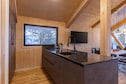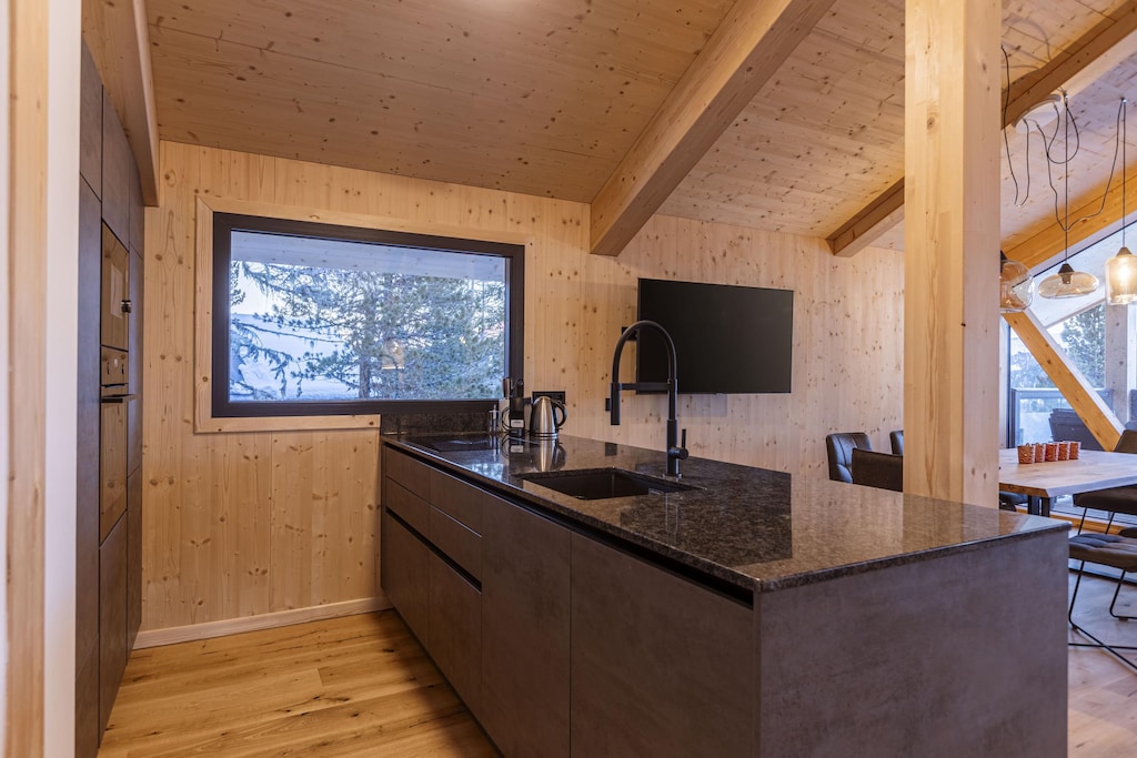 Piano cottura (ceramica, 4 fuochi), Bollitore, Tostapane, Caffettiera (per caffé americano, espresso), Forno, Grill, Forno a microonde, Lavastoviglie, Frigorifero (+ congelatore)