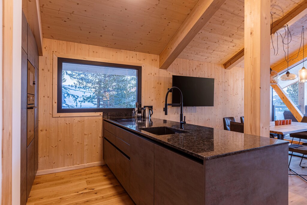 La cucina open space è completamente attrezzata con posate, pentole, piano cottura in vetroceramica, forno, lavastoviglie e frigorifero con congelatore, oltre a tostapane, bollitore, macchina per il caffè filtro e macchina per il caffè a capsule Nespresso. Al vostro arrivo vi verrà fornito un piccolo set di base con prodotti essenziali per la pulizia. Ulteriori comfort includono Wi-Fi gratuito, TV, una tessera maggiordomo (dettagli forniti in loco), un asciuga scarponi da sci e riscaldatori radianti sul balcone per riunioni intime.