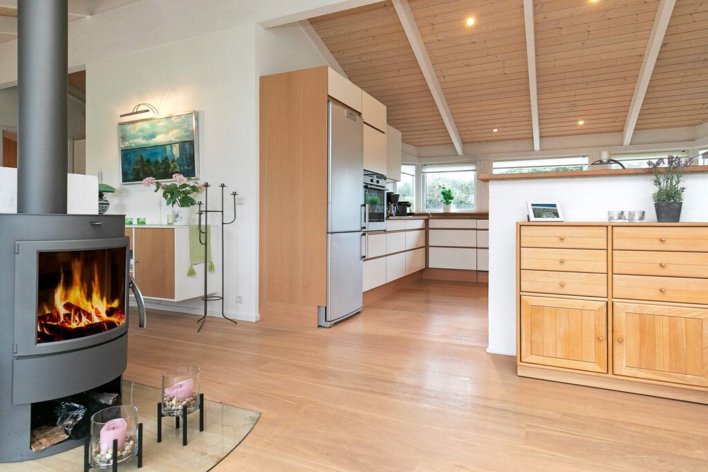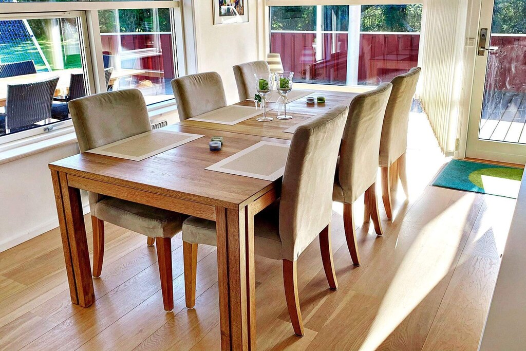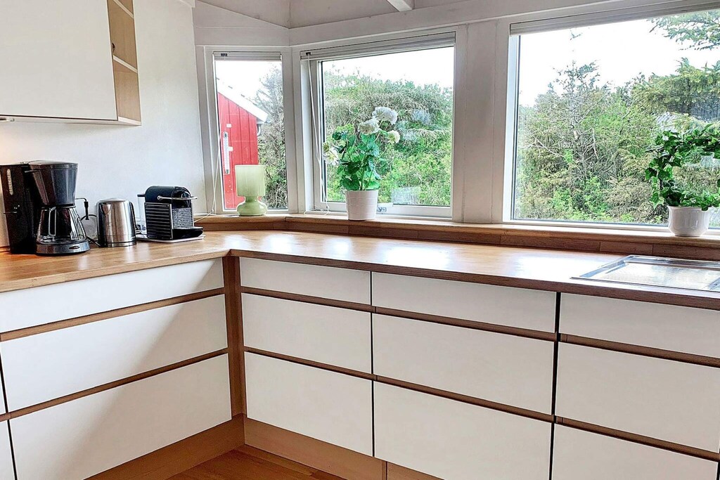 Casa vacanza con sauna situata su un grande e magnifico terreno nella famosa zona turistica Grønhøj Strand, che consente passeggiate lungo i sentieri segnalati, dove si può godere della natura in pace e tranquillità. Il cottage è moderno e ha il giusto stile cottage, nonché una sauna e una bellissima terrazza solarium. Il soggiorno offre un'ampia finestra che invita alla luce del giorno e al bellissimo ambiente naturale all'interno, mentre il soffitto fino al soffitto si illumina e contribuisce a creare l'atmosfera perfetta per le vacanze. Cucina aperta ben attrezzata e graziosa zona pranzo con accesso diretto alla terrazza coperta. Quattro ampie camere da letto con ampi ripostigli e due bagni di cui uno con sauna. All'esterno, si estende un bellissimo ambiente terrazzato, quindi è facile trovare un punto di sole indipendentemente dall'ora del giorno. Il caffè mattutino e i panini possono essere consumati sulla terrazza est, e più tardi durante la giornata puoi spostarti nella sezione esposta a sud quando è il momento per un pisolino al sole. La sera, potresti preferire la terrazza coperta, così puoi sederti fuori e goderti la vista del paesaggio dunare, anche se cade la rugiada. Ci sono porte da calcio e un trampolino (utilizzato a proprio rischio/assicurazione). Non in affitto a gruppi di giovani.