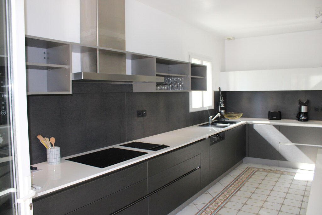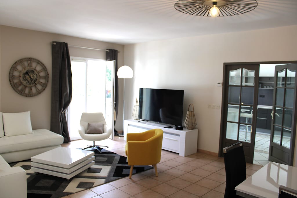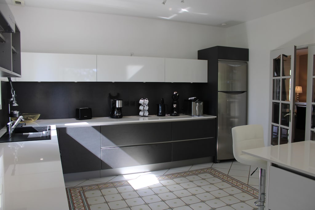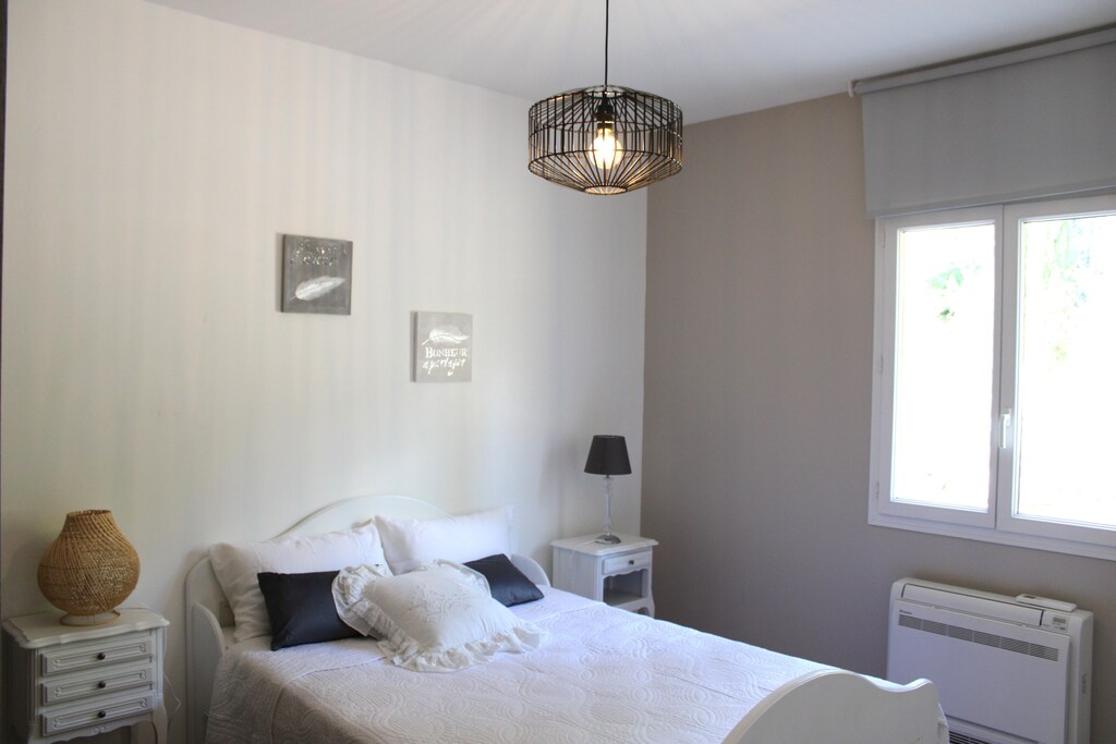 Dalla sala arrivi si accede ad un ampio soggiorno con molta luce e accesso diretto alla terrazza e alla piscina. Gli interni semplici fanno sembrare tutto spazioso e c'è un'area salotto con sedili bianchi e uno spazioso tavolo da pranzo. Successivamente troverai una cucina completamente attrezzata per preparare un pasto delizioso. La camera da letto principale si trova a sud con una bellissima vista sulla piscina e una delle camere da letto è ideale per i bambini. La casa è dotata di aria condizionata e raffreddamento a pavimento. Entrambi i sistemi possono essere trasformati in impianto di riscaldamento nelle giornate più fredde. La terrazza coperta con un bel tavolo da esterno fornisce l'ombra necessaria, potete organizzare accoglienti barbecue e godervi le giornate di sole dentro o intorno alla piscina sui comodi lettini.