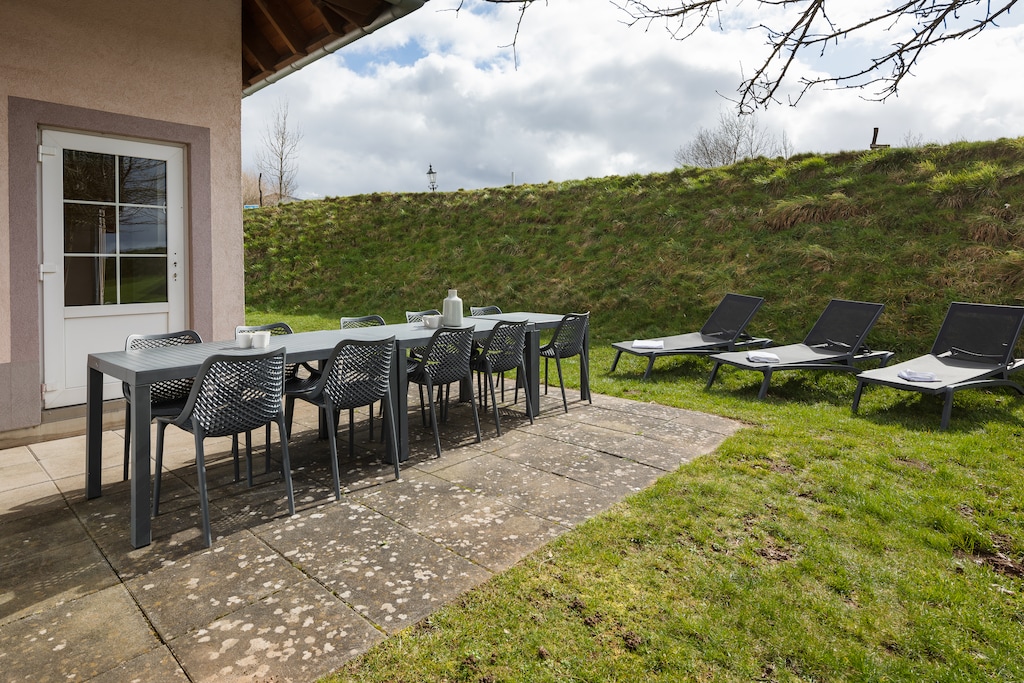 C'è un giardino con terrazza e mobili da giardino e un parcheggio per un'auto vicino alla villa.