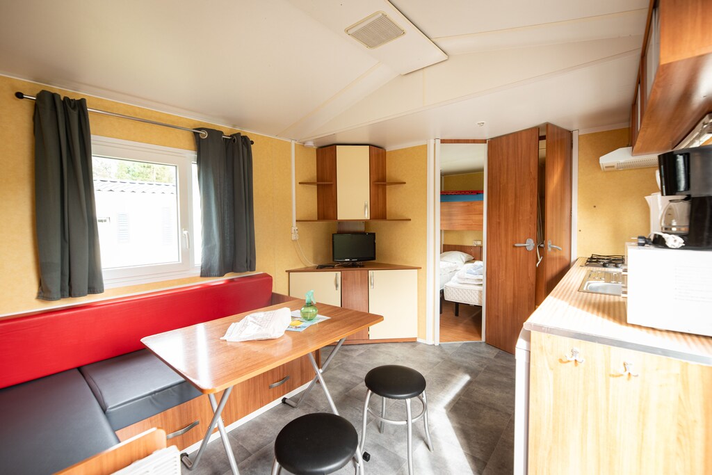 We stayed in the mobile home for a weekend and it was such a great experience! The kids loved the loft bed and the terrace was awesome for morning coffee, The outdoor pool was a nice bonus, even though we didn’t get to use it much, Clean and had everything we needed, Wouldn’t mind coming back for a longer stay