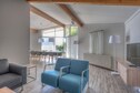 Questo spazioso bungalow è suddiviso in due sezioni separate, accessibili tramite un ingresso centrale. Una sezione comprende un accogliente soggiorno con smart TV, una cucina a pianta aperta con lavastoviglie e forno a microonde, una camera matrimoniale, un bagno con doccia e un WC separato nel corridoio. L'altra sezione funge da zona notte con quattro ulteriori camere matrimoniali, un secondo bagno con doccia e un altro WC separato. Tutti i letti sono singoli con box-spring, che possono essere trasformati in matrimoniali all'occorrenza. Il bungalow è ideale per gruppi numerosi che desiderano sia spazi condivisi che privati.