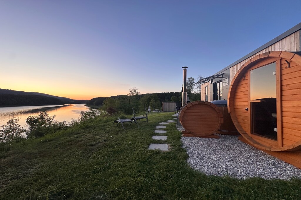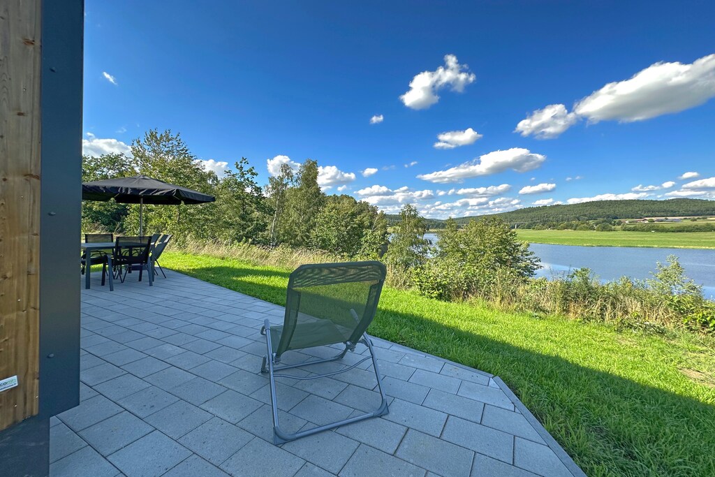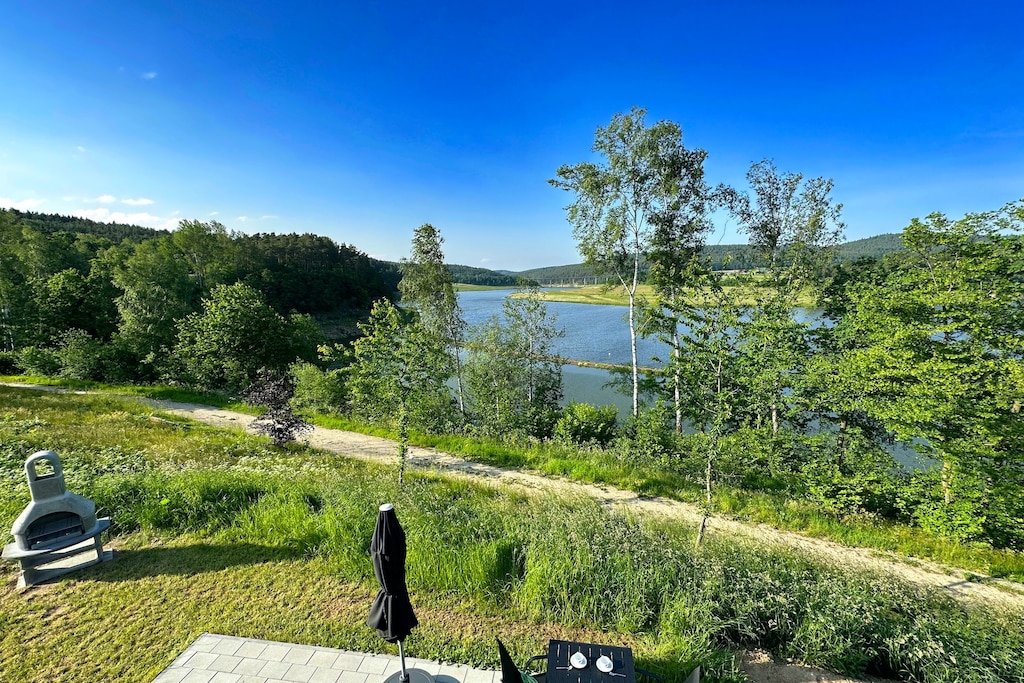 Accedete alla vostra terrazza privata con camino, barbecue, mobili da giardino, ombrellone e lettini prendisole, perfetta per il relax in riva al lago. I servizi includono Wi-Fi, TV, lavastoviglie e parcheggio privato. La regione circostante è un paradiso per escursioni a piedi, in bicicletta, pesca, vela e golf, con sentieri panoramici che si snodano tra brughiere e montagne.