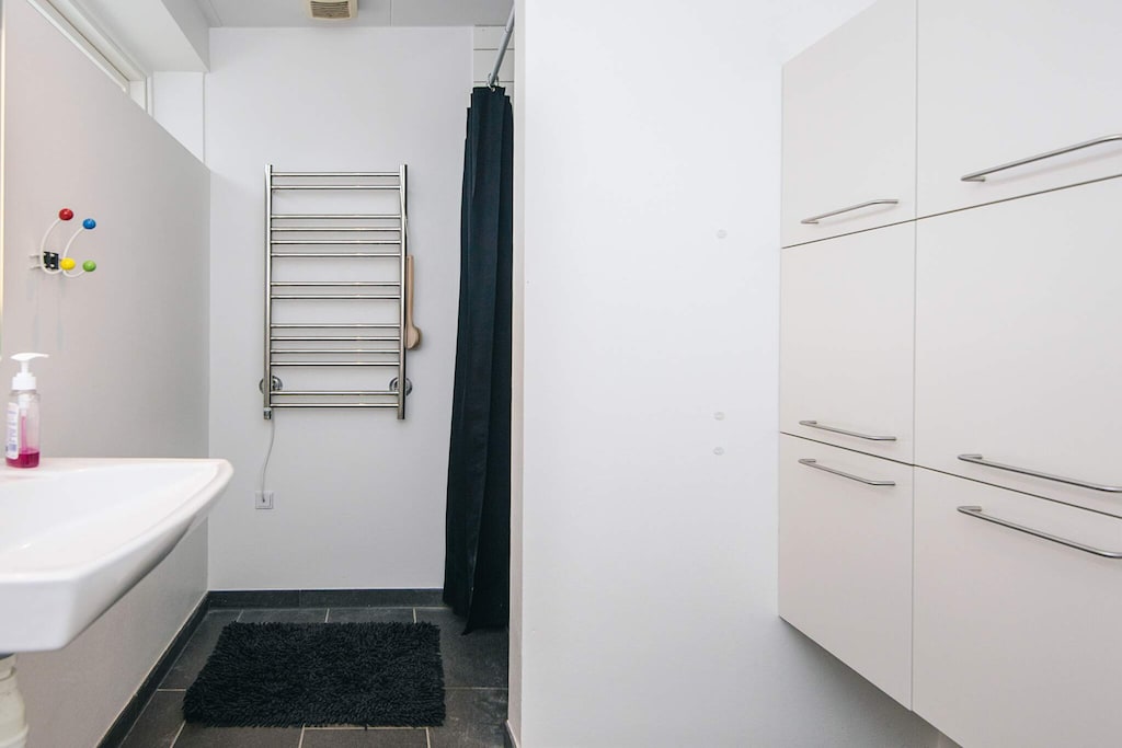 Al piano terra si trova anche un'ampia camera da letto con letto matrimoniale e un bagno con WC, lavandino, ampio box doccia, scaldasalviette, lavatrice e asciugatrice. Le ampie finestre al piano terra sono dotate di tende/persiane esterne a lamelle, comandabili tramite telecomando.