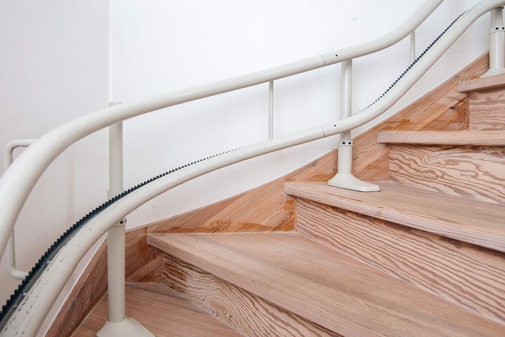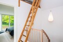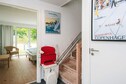 Un montascale è stato installato dal piano terra al primo piano, rendendolo accessibile anche a persone con difficoltà motorie. Al primo piano si trova un'altra spaziosa camera da letto con letto matrimoniale e un bagno con WC, lavandino, scaldasalviette e box doccia. Soggiorno con divano, stufa a legna e TV con Chromecast per lo streaming dei propri servizi. Dal soggiorno si accede all'ampia terrazza panoramica con mobili da salotto. Dal primo piano si accede anche a un soppalco.