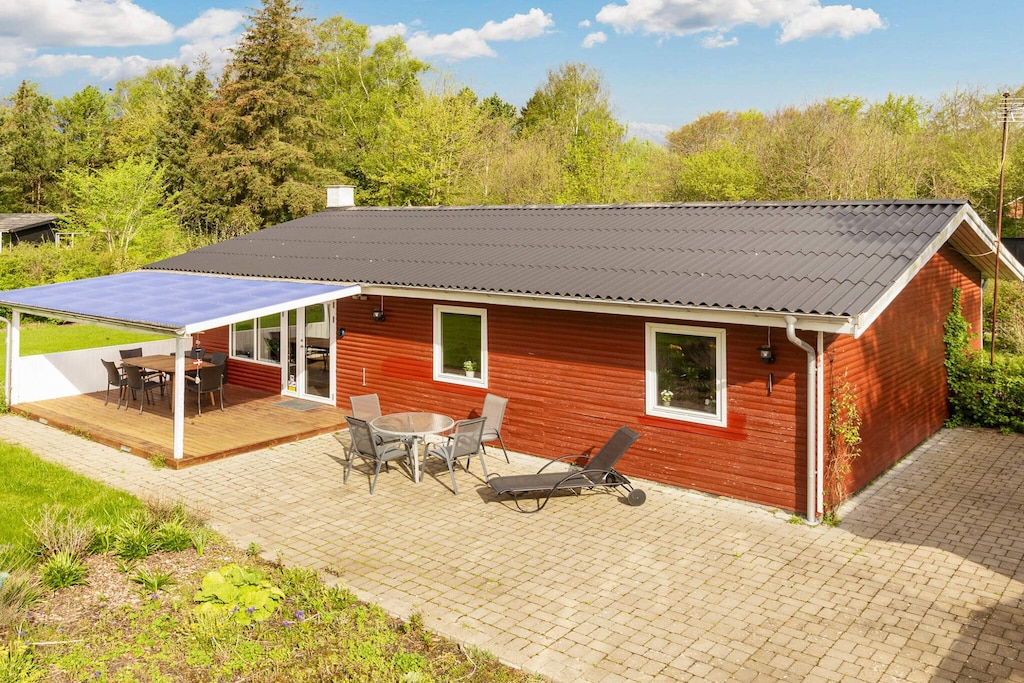 All'esterno, vi attende un'ampia terrazza in legno protetta dal vento, con una zona coperta e una scoperta per mangiare all'aperto, prendere il sole o rilassarsi all'aria aperta. La proprietà è circondata da un ampio prato e da alberi che garantiscono la privacy. Per una maggiore comodità, è disponibile un punto di ricarica per auto elettriche in loco. La casa non è disponibile per l'affitto a gruppi di giovani o artigiani.