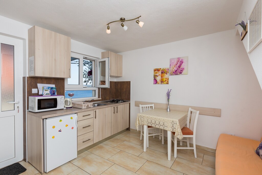 Lovely and cosy apartment with a beautiful terrace with outdoor furniture overlooking the Ariatic sea. SAT TV, WiFi and air-conditioning are at guests'disposal. Kitchenette is equipped with a dining table, microwave, water kettle, refrigerator and a stove. Bathroom is with a shower, hair dryer and washing machine