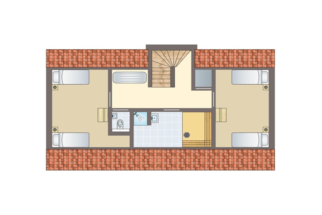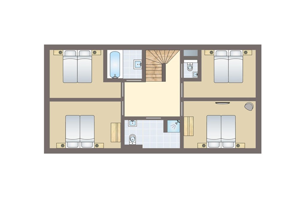 The holiday home is situated in the wooded area of the holiday park. Set over three floors, the home is comfortable and fully appointed. On the ground floor is a pleasant living room with a TV and an open plan kitchen that includes a combination microwave and dishwasher. There is a separate toilet in the hall. A storage room makes it complete. On the first floor there are four double bedrooms, each equipped with two single box-spring beds. In one bedroom these beds are arranged as a double bed. This bedroom has a TV. There are also two bathrooms, one with a shower and toilet and one with a bath. There's a separate toilet on the landing. On the second floor are two more double bedrooms, each with two single box-spring beds. One bedroom has a sunbed. There is also a third bathroom with a shower and sauna. Here you can relax and enjoy your well-deserved holiday. A cot, high chair and stair gate are available.