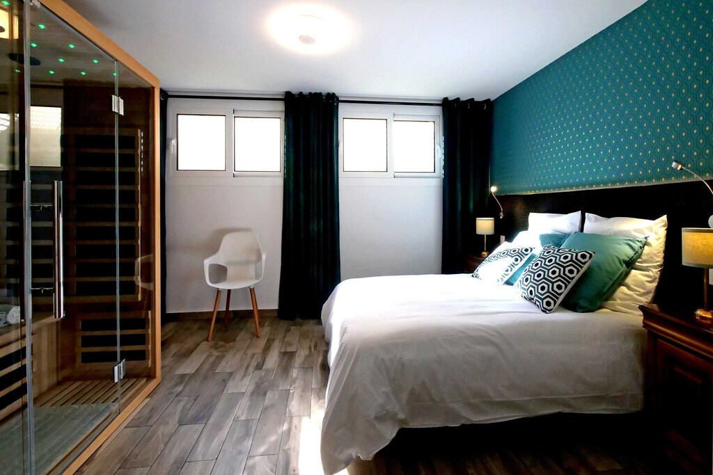 Very pleasant duplex/souplex for couples, modern decoration, well-equipped kitchen with appreciated condiments included, However, we couldn't use the sauna as it caused power outages in the apartment three times, leaving us without electricity for several minutes, The TV is, in my opinion, too small or too far from the sofa, which is a minor detail but can be inconvenient when wanting to watch a movie, Very easy check-in process and great responsiveness,