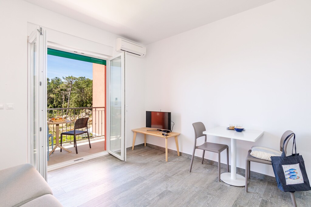 Overlooking the Adriatic sea this one-bedroom apartment with furnished balcony is perfectly fit for up to three people. Free WIFI, air conditioning as well as SAT LCD are provided. The open space living room comes with a sofa and it is combined with the equipped kitchenette and dining area. The bedroom features a large double bed while the private bathroom comes with a shower, toilet, hairdryer and free toiletries.