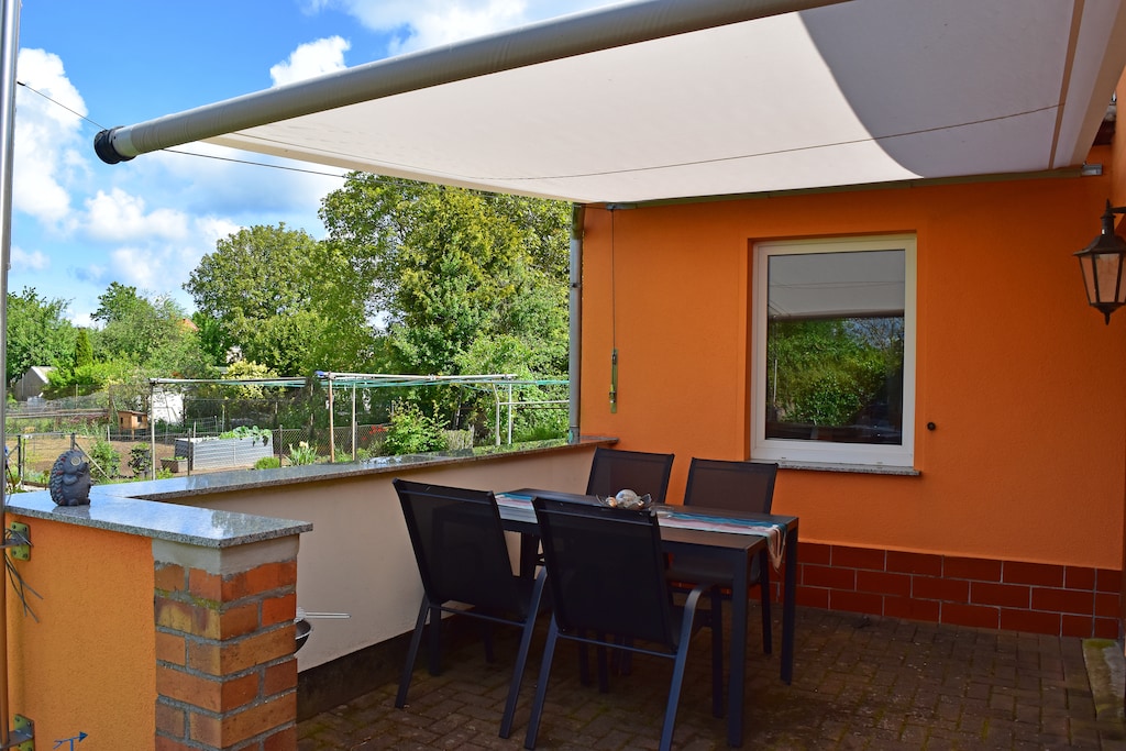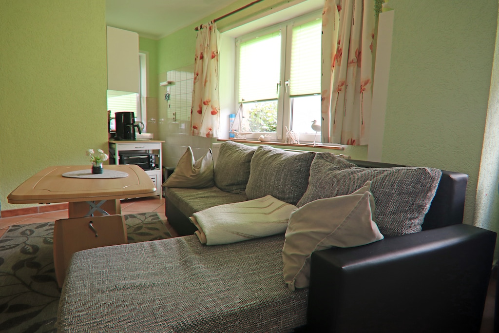 Questo bungalow trilocale, arredato in modo confortevole, è ideale per le famiglie e si trova nella proprietà del proprietario. Dispone di un soggiorno con un piccolo angolo cottura integrato, una camera da letto, una cameretta per bambini e un bagno con doccia e WC. Sull'accogliente terrazza, arredata con comodi mobili da giardino, potrete godervi appieno la vostra vacanza e rilassarvi, oppure organizzare una splendida serata barbecue. L'arredamento non lascia nulla a desiderare. L'ampio giardino è ideale per i bambini e, se necessario, potrete acquistare uova fresche di fattoria dai cordialissimi proprietari.