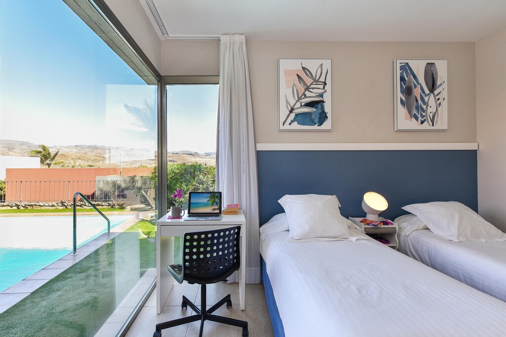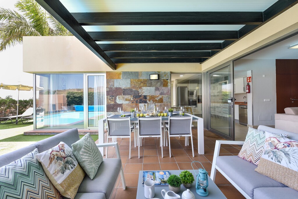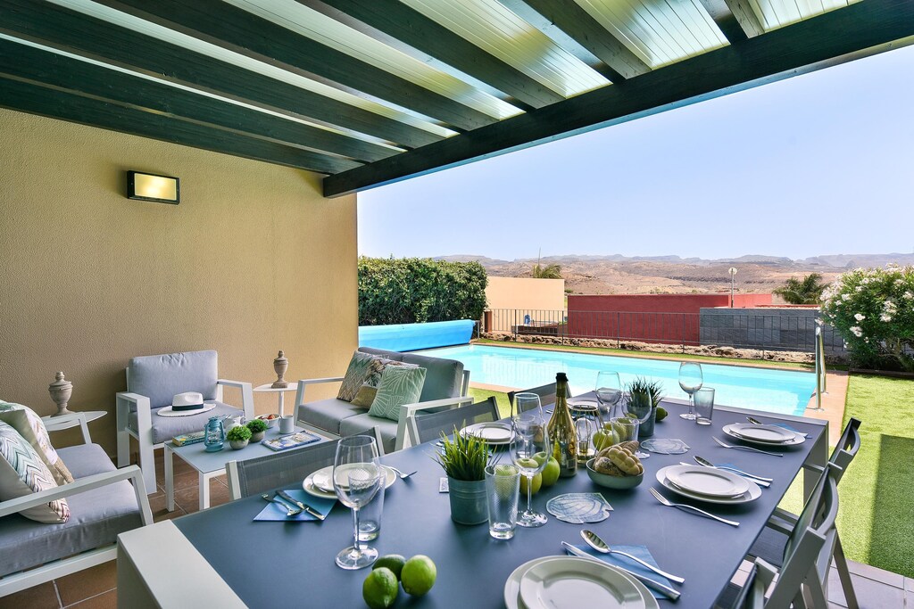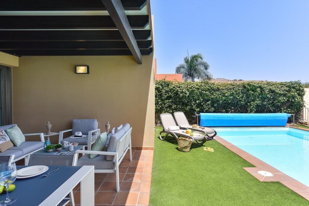 Confortevole casa vacanze al piano terra per un massimo di quattro adulti con un giardino ben curato e una piscina all'aperto riscaldata. Il soggiorno, decorato con pietra naturale, offre un piacevole rifugio con smart TV e aria condizionata. Ma la grande terrazza coperta con confortevoli mobili da giardino invita a piscine o barbecue. Nella spaziosa cucina puoi cucinare con tutta la famiglia. Il pane fresco viene consegnato ogni giorno per la colazione condivisa. Non solo dal soggiorno, ma anche dalle due camere da letto hai una splendida vista sulla piscina e sul giardino. Trascorri una vacanza rilassante accanto al campo da golf di Salobre. Maspalomas, il più antico resort turistico sulla costa meridionale, è a pochi minuti di auto. Nel centro di Maspalomas o Meloneras troverete una varietà di negozi e vita notturna. Maspalomas è meglio conosciuto per le enormi dune con una lunghezza di sei e una larghezza di un massimo di due chilometri, che dal 1987 sono sotto la protezione della natura - proprio come l'oasi "La Charca", un terreno riproduttivo per gli uccelli acquatici, situati al Faro "El Faro" è in Maspalomas.