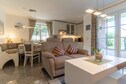 Il soggiorno colpisce per la confortevole area salotto con tavolino e un sistema multimediale con schermo piatto e lettore Blu-ray. La cucina completamente attrezzata con stoviglie di alta qualità non lascia nulla a desiderare: sono disponibili un grande frigorifero con congelatore da 90 litri, piano cottura, forno, lavastoviglie, microonde, macchina per il caffè, macchina per il caffè Senseo, tostapane e bollitore. Un'accogliente sala da pranzo con panca ad angolo offre spazio sufficiente per pranzare insieme. Anche i pavimenti del soggiorno, della zona cucina, del bagno e del corridoio sono realizzati in elegante granito.