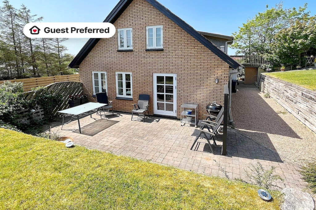 La cucina a pianta aperta è dotata di lavastoviglie, microonde, forno a convezione, piano cottura in vetroceramica e frigorifero/congelatore, e si collega perfettamente alla zona pranzo e al soggiorno. Una TV con canali tedeschi e danesi gratuiti e la connessione Wi-Fi ad alta velocità in fibra ottica garantiscono intrattenimento e connettività. Dalla zona giorno si accede alla terrazza e al giardino, perfetti per cenare o rilassarsi all'aperto.