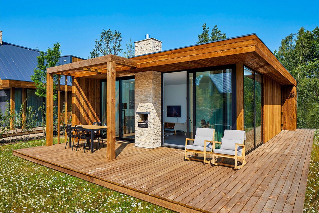 Questa spaziosa villa di 90 m² al piano terra è progettata per ospitare quattro persone in un ambiente moderno e luminoso. Dotata di due lussuose camere da letto, ciascuna con comodi letti a molle, bagni privati e servizi igienici privati, offre un rifugio perfetto per chi cerca relax e comfort. La zona giorno open space massimizza la luce naturale, con una grande porta scorrevole in vetro che si apre su una terrazza galleggiante. La terrazza è ideale per godersi la natura circostante, con un grande tavolo da pranzo e un camino esterno, creando un'atmosfera tranquilla per il relax all'aperto.