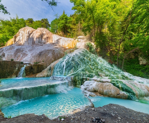Le Terme di Saturnia, nel cuore della Maremma toscana non lontano da Grosseto, sono tra le più belle terme naturali d’Italia e le più famose, non solo del nostro Paese, ma a livello mondiale. La sorgente termale, che sgorga ad una temperatura di circa 37,5° C, alimenta le iconiche piscine delle Cascate del Mulino, sito naturalistico di straordinaria bellezza grazie alle vasche di calcare naturalmente disposte su diversi livelli; il sito è gratuito e aperto a tutti. Visitare le Terme di Saturnia e rilassarsi nelle vasche naturali delle Cascate del Mulino sono un'ottima idea per passare un weekend da sogno, anche fuori stagione.